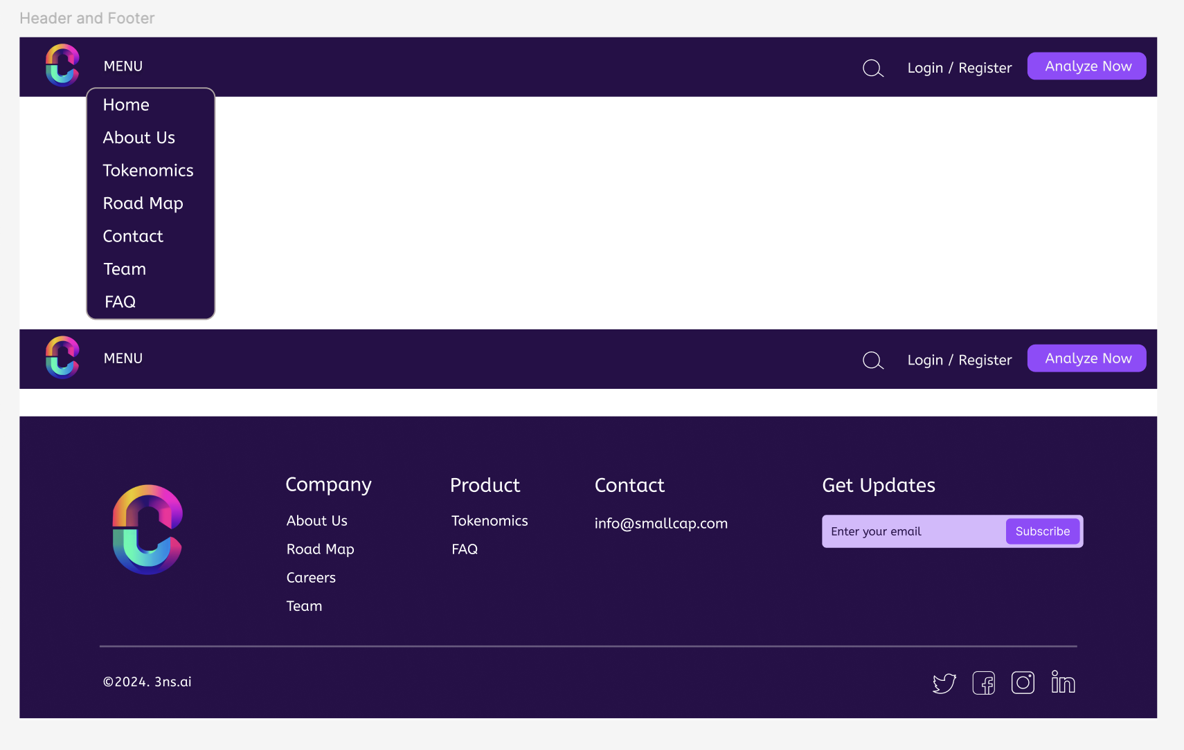 During my internship for the startup "Smallcap.ai", I was tasked with creating UI mockups for the initial website launch as well as transforming those mockups into working sites using React. Below are some side by side comparisons of the UI mockup designs created in Figma, and their functioning React counterparts. Additionally included are logo ideas, and designs for the header and footer of the website.